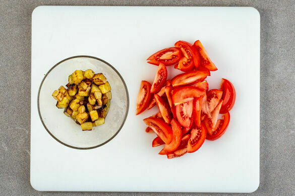 Die Zucchiniwürfel in der Pfanne mit 1EL Olivenöl bei mittlerer Hitze 3–4Min. goldbraun anbraten. Aus der Pfanne nehmen und beiseitestellen. Nach Belieben mit Salz und Pfeffer würzen. Die Tomaten in dünne Spalten schneiden.