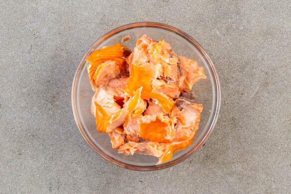 Die Haut entfernen und den Lachs mit einer Gabel grob zerteilen, evtl. vorhandene Gräten mit einer Pinzette entfernen.