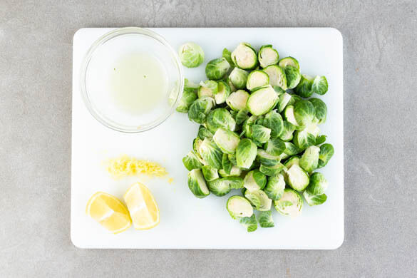 Den Rosenkohl am Strunk knapp abschneiden und längs halbieren. Die Außenblätter abzupfen und beiseitelegen. Die Zitronenschale abreiben und die Zitrone halbieren, eine Hälfte auspressen, die andere Hälfte in Spalten schneiden.