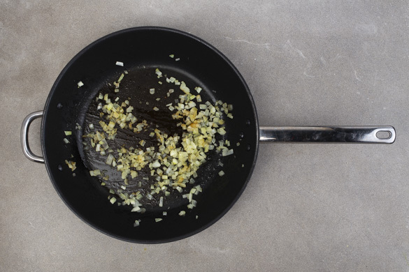 Die Zwiebel schälen, halbieren und in feine Würfel schneiden. 1EL vegane Margarine in einer großen Pfanne bei mittlerer Hitze schmelzen, dann die Zwiebeln 1–2Min. glasig anschwitzen. Die Pfanne beiseitestellen und die Zwiebeln abkühlen lassen.