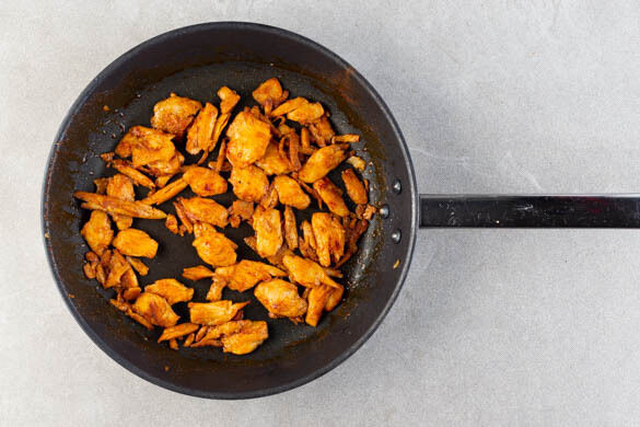 Die veganen Hähnchenschnetzel in einer großen Pfanne mit 2EL Olivenöl, der ½ Paprikapulvers und 1 Prise Salz bei starker Hitze in 4–6Min. goldbraun und knusprig anbraten.