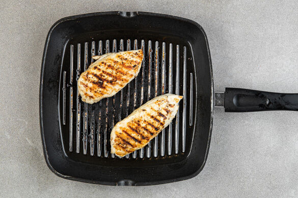 Das Fleisch trocken tupfen, horizontal halbieren und mit 1EL Olivenöl sowie je 1 Prise Salz und Pfeffer einreiben. In der Grillfanne bei mittlerer Hitze auf jeder Seite 2–3Min. braten, bis das Fleisch durch ist. Den Salat mit dem Hähnchen und den Sonnenblumenkernen garniert servieren.
