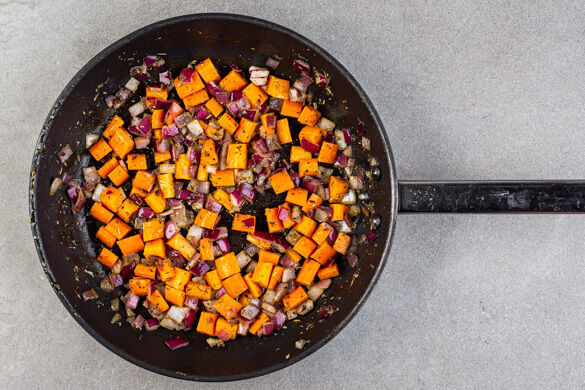 Die Zwiebeln, die Karotten, die ½ der Gewürzmischung und ½TL Salz in einer mittelgroßen Pfanne mit 1EL Olivenöl bei mittlerer Hitze 4–5Min. anbraten, dabei gelegentlich umrühren.