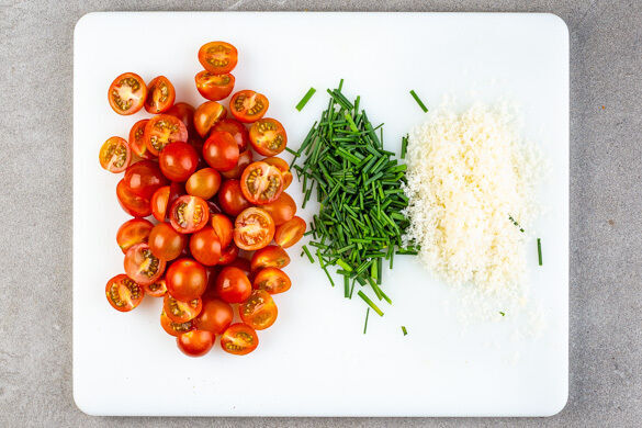 Die Kirschtomaten halbieren. Den Schnittlauch in ca. 1cm lange Röllchen schneiden. Den Käse fein reiben.