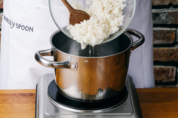 Den Reis in einem Sieb kalt abspülen, bis das Wasser klar bleibt. Sobald das Wasser kocht, den Reis hineingeben und abgedeckt bei niedrigster Hitze 12–14Min. kochen, bis das Wasser aufgesogen und der Reis gar ist. Noch ca. 5Min. ohne Hitzezufuhr ziehen lassen.
