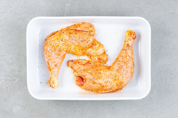 Die Hähnchenschenkel mit etwas Küchenkrepp trocken tupfen, dann mit 1EL Olivenöl, ca. 1/3 des Paprikapulvers und 1 Prise Salz einreiben und in eine Auflaufform legen. Im Ofen 30–35Min. backen, bis sie schön knusprig sind und das Fleisch durch ist, dabei alle 10Min. wenden.