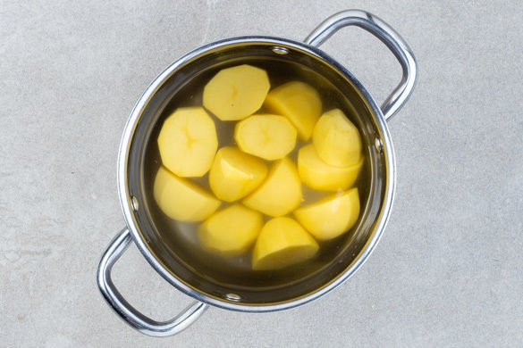 Die Kartoffeln schälen und je nach Größe halbieren oder vierteln. In einem weiteren mittelgroßen Topf mit leicht gesalzenem Wasser bedeckt zum Kochen bringen und ca. 15Min. köcheln lassen, bis die Kartoffeln gar sind. In ein Sieb abgießen und anschließend warm halten.