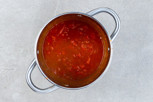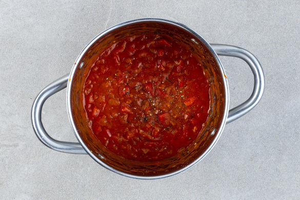 Die Zwiebeln und den Knoblauch in einem mittelgroßen Topf mit 1EL Olivenöl bei mittlerer Temperatur 2–3Min. anschwitzen. Mit dem restlichen Paprikapulver und 1–2TL Mehl bestäuben und das Tomatenmark unterrühren. Mit 250ml Wasser ablöschen und das Brühgewürz unterrühren. Die Sauce einmal aufkochen lassen, die Paprika dazugeben und abgedeckt ca. 5Min. köcheln lassen.
