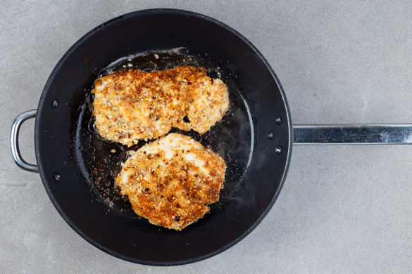 Das Fleisch mit etwas Küchenkrepp trocken tupfen, dann zwischen zwei Lagen Frischhaltefolie mit einem Fleischklopfer oder Boden einer schweren Pfanne flach klopfen und nacheinander in etwas Mehl, 1 verquirltem Ei und der Nussmischung panieren.