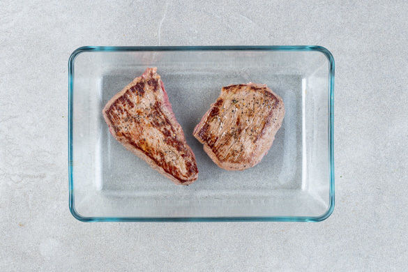 Das Fleisch mit etwas Küchenkrepp trocken tupfen und mit Salz und Pfeffer würzen. In einer mittelgroßen Pfanne mit 1EL Olivenöl bei starker Hitze auf jeder Seite ca. 1Min. scharf anbraten, aus der Pfanne nehmen und in eine Auflaufform geben und im Ofen ca. 5Min. nachgaren. Das Fleisch vor dem Anschneiden aus der Auflaufform nehmen und kurz ruhen lassen.