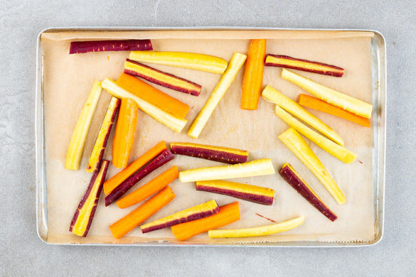Die Karotten auf einem mit Backpapier ausgelegten Backblech mit 2–3EL Olivenöl sowie 4–5 Prisen Salz und Zucker vermengen, gleichmäßig verteilen und 15–18Min. im Ofen rösten.