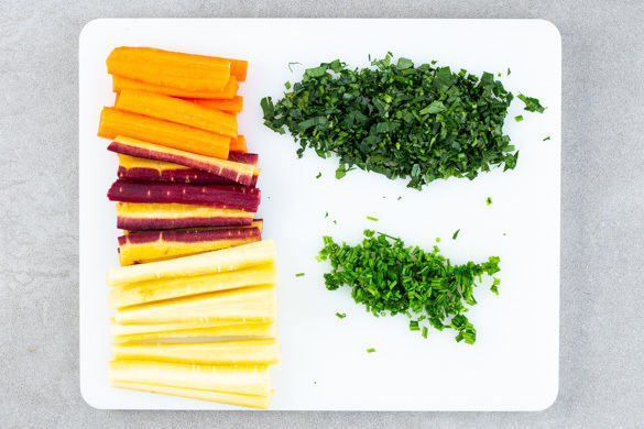 Den Backofen auf 200°C Umluft (220°C Ober-/Unterhitze) vorheizen. Die Karotten schälen, dann quer halbieren und je nach Dicke längs vierteln oder sechsteln. Die Petersilie samt Stängeln fein hacken. Den Schnittlauch in feine Röllchen schneiden.