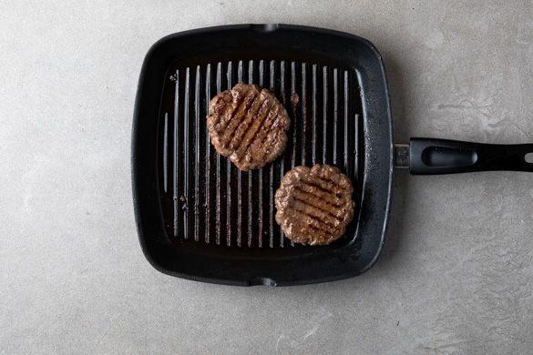 Eine Grillpfanne mit 1EL Olivenöl einpinseln und die Pattys bei starker Hitze auf jeder Seite 3–4Min. anbraten. Tipp: Wer keine Grillpfanne hat, kann die Pattys auch in der Zwiebelpfanne braten.