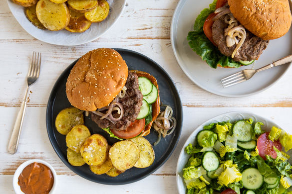 Burger-Zeit bei Marley Spoon macht alle glücklich. Die saftigen Pattys aus Rinderhackfleisch werden mit frischem Gemüse und würzigen Röstzwiebelstreifen belegt, die knusprigen Burgerbrötchen mit einer rauchigen BBQ-Mayonnaise-Creme bestrichen. Das schmeckt Groß und Klein, Alt und Jung, und bei uns in der Testküche ging das auch weg wie nix!