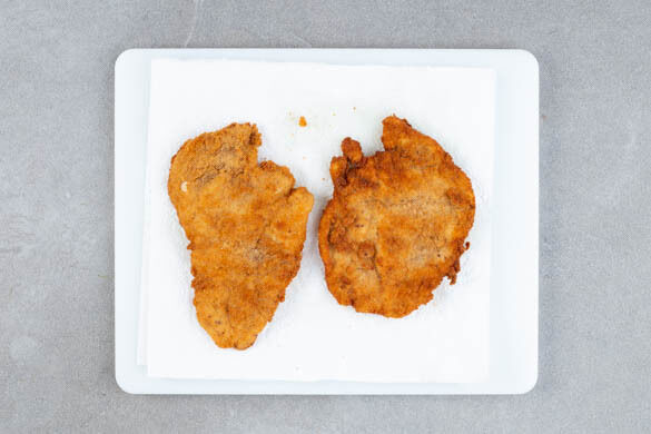 Eine große Pfanne mit einer ca. 0,5cm hohen Schicht Pflanzenöl bei starker Hitze erwärmen. Die Schnitzel in das heiße Öl geben und auf jeder Seite 2–3Min. goldbraun anbraten. Die Hitze ggf. reduzieren, falls die Panade zu schnell bräunt. Die Schnitzel auf etwas Küchenkrepp abtropfen lassen und mit 1 Prise Salz würzen.