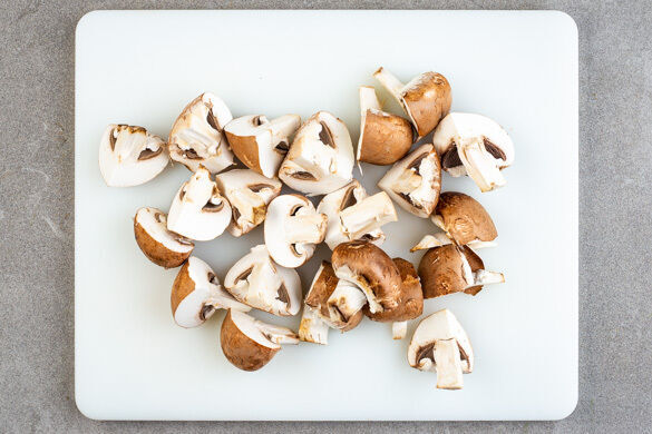 In einem mittelgroßen Topf ausreichend gesalzenes Wasser für die Nudeln zum Kochen bringen. Die Pilze ggf. säubern und je nach Größe halbieren oder vierteln.