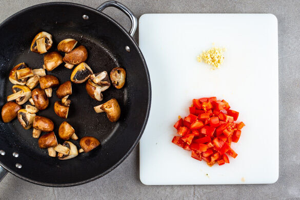 Die Pilze in einer mittelgroßen Pfanne oder einem Wok mit 1EL Pflanzenöl bei mittlerer bis starker Hitze 3–4Min. goldbraun anbraten. Den Knoblauch schälen und fein würfeln. Die Tomaten in ca. 1cm große Würfel schneiden. Die Pilze aus der Pfanne nehmen und beiseitestellen, die Pfanne aufbewahren.
