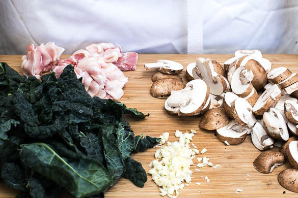 In einem mittelgroßen Topf ausreichend leicht gesalzenes Wasser für die Pasta zum Kochen bringen. Den Schwarzkohl von harten Stielen befreien und schräg in ca. 1cm dünne Streifen schneiden. Die Pilze ggf. mit einer Bürste oder Küchenkrepp säubern und in ca. 0,5cm dünne Scheiben schneiden. Den Knoblauch schälen und fein würfeln. Den Bacon in ca. 1cm dünne Streifen schneiden.