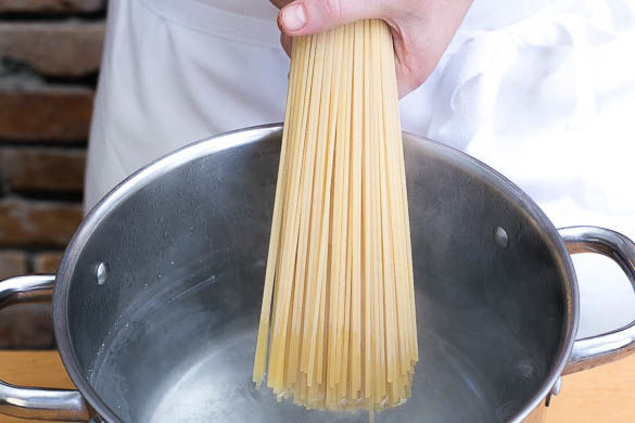 Die Pasta in das kochende Wasser geben und in 7–9Min. bissfest kochen. Das Wasser vorerst nicht abgießen.