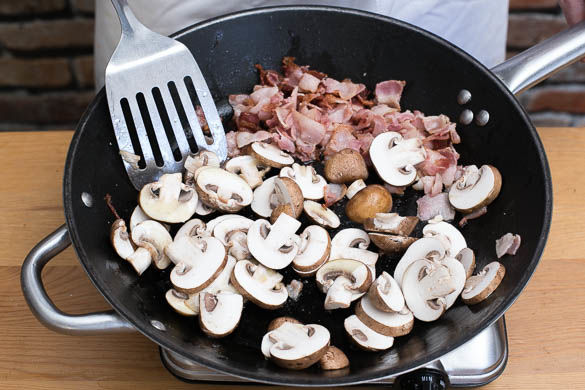 Den Bacon in einer großen Pfanne mit 1EL Olivenöl bei mittlerer Hitze 4–5Min. knusprig braten, dann auf eine Seite der Pfanne schieben. Die Pilze auf die freie Seite der Pfanne geben und 3–4Min. goldbraun anbraten. Den Knoblauch dazugeben, alles mischen und ca. 1Min. fertig braten.