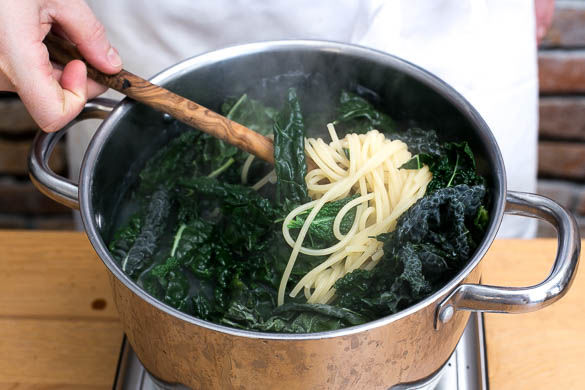 Den Schwarzkohl während der letzten ca. 3Min. der Kochzeit zur Pasta in den Topf geben und mitkochen. Mit einer Tasse etwas Pastawasser abschöpfen, dann die Pasta und den Schwarzkohl in ein Sieb abgießen und abtropfen lassen.
