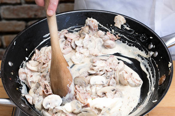 Die Crème fraîche zu den Pilzen in die Pfanne geben, gut unterrühren und die Sauce noch ca. 2Min. sanft köcheln lassen. Mit Salz und Pfeffer abschmecken. Den Käse fein reiben.