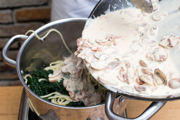 Die Pasta und den Schwarzkohl mit der Sauce vermengen, dabei nach Bedarf etwas Pastawasser hinzufügen, falls die Sauce zu trocken geworden ist. Die Bacon-Schwarzkohl-Carbonara mit dem Käse garnieren und servieren.