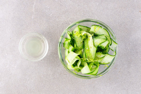Die Gurke mit einem Sparschäler rundum bis zum Kerngehäuse in breite Streifen schneiden und vorsichtig mit 1/2TL Salz vermengen. Die Limettenschale abreiben, dann die Limette halbieren und auspressen.