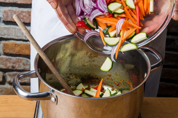 Die Zwiebeln in einem großen Topf mit 1EL Pflanzenöl bei mittlerer Hitze ca. 2Min. anbraten. 3–4EL Currypaste oder nach Geschmack mehr dazugeben und ca. 30Sek. mitrösten. Vorsicht, die Paste ist leicht scharf. Die Paprika, die Zucchini und die Karotten dazugeben. Alles gut verrühren, mit 1 kräftigen Prise Salz würzen und weitere 1–2Min. braten.