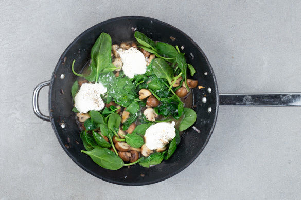 Die Pilze und die restlichen Zwiebeln in derselben Pfanne mit 1–2TL Olivenöl bei starker Hitze 3Min. scharf anbraten. Die Hitze reduzieren und 2TL Mehl unterrühren, dann mit 200–250ml Wasser ablöschen. Die 1/2 des Spinats und die Crème fraîche dazugeben und rühren, bis der Spinat zusammengefallen ist. Mit Salz und Pfeffer würzen und bis zum Anrichten sanft köcheln lassen.