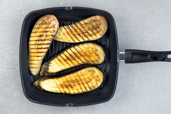 Die Auberginen mit der 1/2 der Gewürzmischung und 1EL Olivenöl einreiben, dann in einer stark erhitzen Grillpfanne auf beiden Seiten ca. 3Min. anbraten, bis deutlich ein Grillmuster zu sehen ist. Tipp: Wer keine Grillpfanne hat, kann auch eine normale Pfanne verwenden.