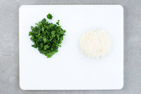 Den Käse fein reiben. Die Petersilienblätter abzupfen und grob hacken. 1TL Petersilie mit 1EL Olivenöl, dem Zitronensaft, 1TL Zitronenabrieb, der restlichen Gewürzmischung und 1/4TL Salz und Pfeffer zu einem Dressing verrühren. Den gebackenen Brokkoli, die Artischocken und die Bohnen mit dem Dressing vermengen.