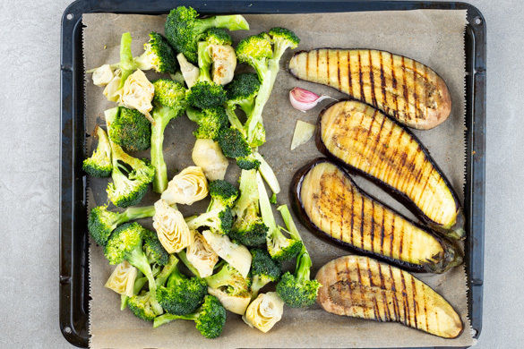Den Brokkoli und die Artischoken auf einem mit Backpapier belegten Backblech mit 1–2EL Olivenöl und je 1 Prise Salz, Pfeffer und Gewürzmischung vermengen und auf der Hälfte des Blechs verteilen. Die Auberginen und den ungeschälten Knoblauch auf die andere Hälfte des Blechs geben und das Gemüse ca. 15Min. im Ofen backen. Die Bohnen während der letzten 5Min. mitbacken.