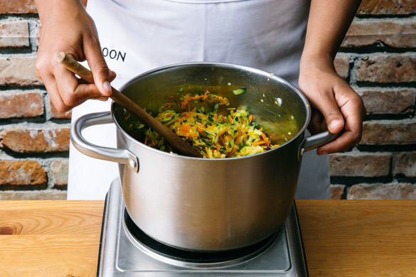 Die Karotten, die Zucchini und die Zwiebeln in einem großen Topf mit 2EL Olivenöl bei starker Hitze 1–2Min. scharf anbraten. Den Backofen auf 200°C Umluft (220°C Ober-/Unterhitze) vorheizen.