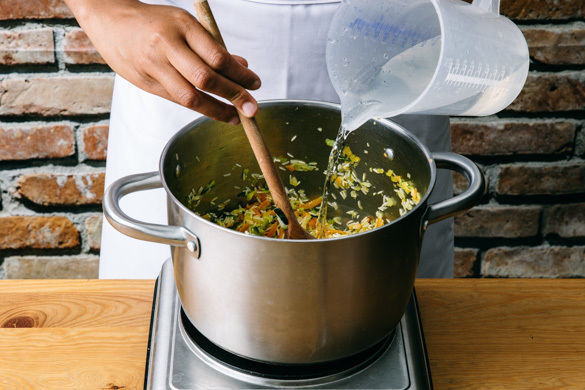 Den Reis in einem Sieb unter fließendem Wasser abspülen, bis das Wasser klar bleibt. Zum Gemüse in den Topf geben und ca. 1Min. mitrösten. Dann das Brühgewürz hinzufügen und mit 800ml heißem Wasser ablöschen. Den Pilaw abgedeckt bei niedriger Hitze 12–15Min. garen und noch ca. 5Min. ohne Hitzezufuhr nachziehen lassen.