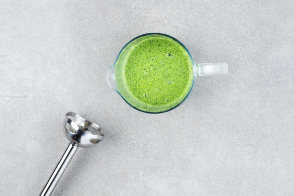 Ca. 1/4 des Rucolas, das Basilikum samt Stängeln, den Knoblauch und die 1/2 der Kürbiskerne mit 4EL Olivenöl, 2EL weißem Essig und 3–4EL Wasser in einem hohen Gefäß zu einem cremigen Pesto pürieren. Mit Salz und Pfeffer abschmecken.