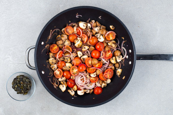 Die restlichen Kürbiskerne in einer mittelgroßen Pfanne ohne Zugabe von Fett bei mittlerer Hitze 1–2Min. anrösten. Auf einem Teller beiseitestellen und die Pilze in derselben Pfanne mit 1–2EL Olivenöl 3–4Min. anbraten. Die Tomaten und die Zwiebeln dazugeben und 2–3Min. mitbraten, dann mit Salz und Pfeffer würzen.