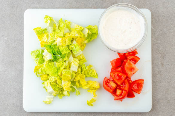 Den Knoblauch schälen und sehr fein würfeln oder durch eine Knoblauchpresse drücken. Den Joghurt mit dem Knoblauch sowie je 1 Prise Gewürzmischung, Salz und Pfeffer vermengen, dabei ggf. mit mehr Gewürzmischung, Salz und Pfeffer nachwürzen. Die Tomate grob würfeln und mit 1 kräftigen Prise Salz vermengen. Den Romanasalat in ca. 2cm breite Streifen schneiden.