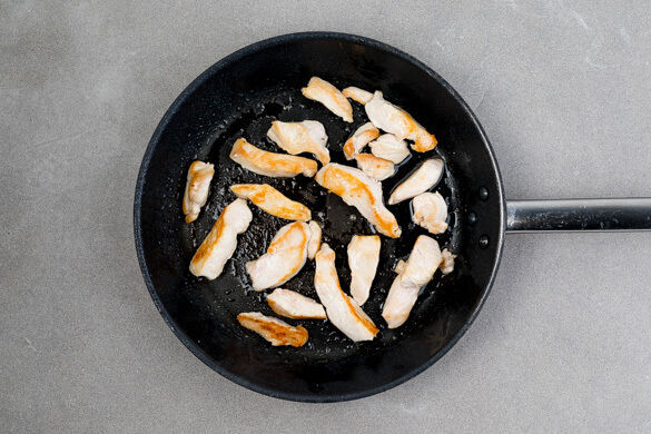 Das Fleisch in einer großen Pfanne mit 2EL Olivenöl bei starker Hitze 3–4Min. goldbraun anbraten. Aus der Pfanne nehmen und beiseitestellen.