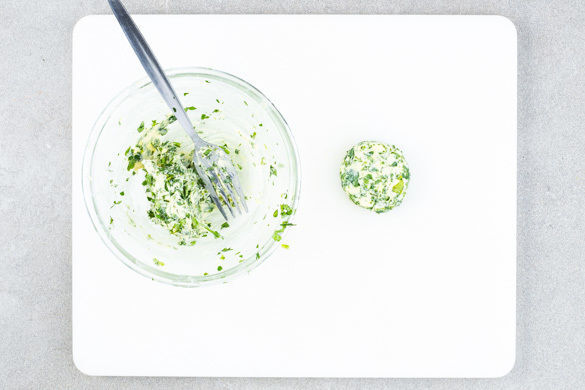 Den Koriander samt Stängeln fein schneiden und mit 4EL weicher Butter vermengen. Mit Salz und Pfeffer würzen, 4 Kugeln formen und diese bis zum Servieren im Kühlschrank aufbewahren.