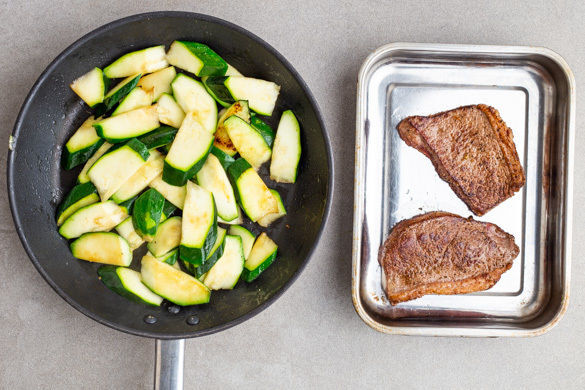 Das Fleisch trocken tupfen, von beiden Seiten mit der Gewürzmischung und 1 Prise Salz einreiben und in der Pfanne mit 2EL Olivenöl bei mittlerer Hitze auf jeder Seite ca. 1Min. anbraten. In eine Auflaufform geben und ca. 5Min. im Ofen medium garen, dann noch 2Min. nachziehen lassen. Die Zucchini in der Pfanne mit 2EL Olivenöl 2–3Min. anbraten und mit Salz und Pfeffer würzen.