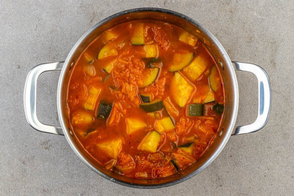 Die Zucchini längs vierteln und in ca. 2cm breite Stücke schneiden. Den Knoblauch schälen und fein würfeln. Die Zucchini, den Knoblauch, das Kimchi und die Chilipaste in den Topf geben und ca. 5Min. mitbraten, bis die Chilipaste leicht am Topfboden ansetzt.