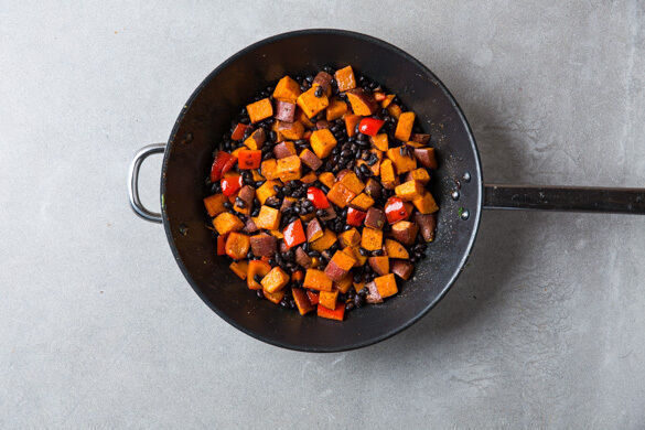Die Bohnen in ein Sieb abgießen, abspülen und abtropfen lassen. Die Paprika in einer zweiten Pfanne mit 1EL Pflanzenöl bei mittlerer Hitze 2–3Min. anbraten. Die Bohnen, die Süßkartoffelwürfel und die restliche Gewürzmischung 1–2Min. mitbraten, dann das Gemüse mit Salz und Pfeffer abschmecken.