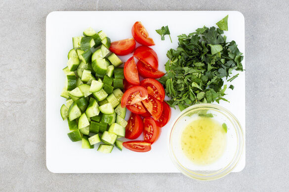 Die Gurke längs vierteln und in kleine Würfel schneiden. Die Tomaten in Spalten schneiden. Die Minzeblätter abzupfen und grob schneiden. Die Petersilie samt Stängeln grob hacken. Den restlichen Zitronensaft mit je 1EL Olivenöl, Essig und Wasser sowie je 1 Prise Salz und Pfeffer zu einem Dressing verrühren.