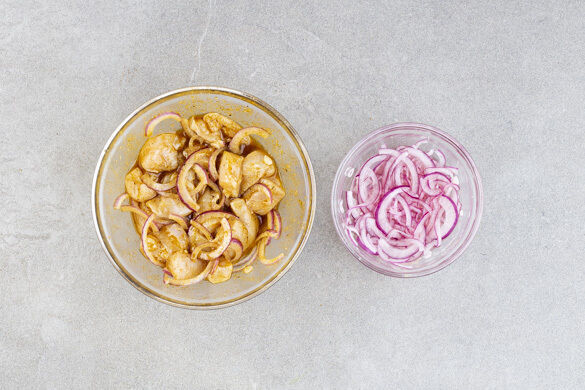 Die Zwiebel schälen, halbieren und in feine Streifen schneiden. Die ½ der Zwiebeln mit 2EL hellem Essig, ½TL Zucker und 1 kräftigen Prise Salz vermengen und beiseitestellen. Die restlichen Zwiebeln unter das Fleisch mengen.