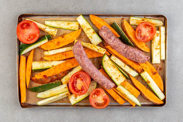 Das Süßkartoffelgemüse auf zwei mit Backpapier ausgelegten Blechen verteilen. Die Tomaten mit der Schnittseite nach oben dazwischensetzen, mit 2TL Olivenöl beträufeln und mit je 1 Prise Salz und Pfeffer würzen. Die Würste darauflegen und alles 22–25Min. im Ofen rösten, bis die Würste und das Gemüse gar sind. Nach der Hälfte der Zeit die Position der Bleche tauschen.