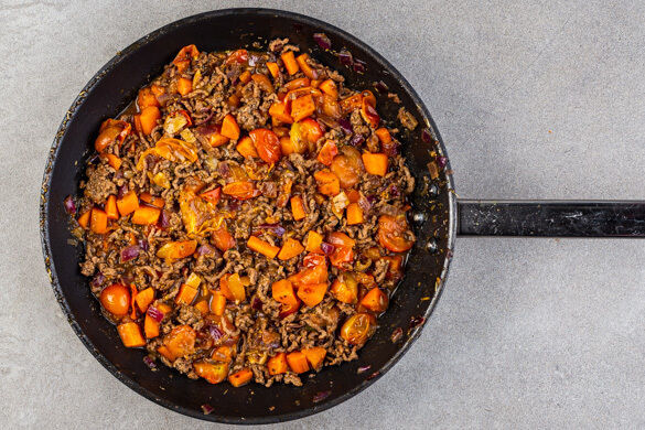 Das Hackfleisch in die Pfanne geben und 1–2Min. mitbraten. Die Tomaten, die Datteln samt Wasser und 1EL Essig hinzufügen und abgedeckt bei mittlerer bis starker Hitze in ca. 4Min. weich köcheln. Die Tomaten mit einer Gabel zerdrücken und ohne Deckel weitere 2–4Min. köcheln lassen, bis die Sauce eingedickt ist. Vom Herd nehmen und mit Salz und Pfeffer abschmecken.