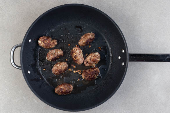 Die Hackmasse in 16 gleich große Kugeln formen, dazu am besten die Hackmasse in 2 Portionen teilen und jede Portion wiederum teilen, bis die gewünschte Anzahl erreicht ist. Die Hackkugeln leicht flach und in eine ovale Form drücken, dann in einer großen Pfanne mit 2EL Olivenöl bei mittlerer bis starker Hitze auf jeder Seite 2–3Min. braten, bis das Fleisch gar und goldbraun ist.
