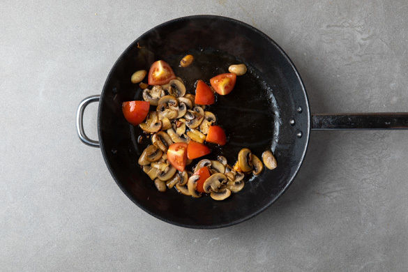 Die Pilze in einer großen Pfanne bei starker Hitze ohne Zugabe von Fett 2–3Min. goldgelb anbraten. Die Tomaten dazugeben und 1–2Min. mitbraten.