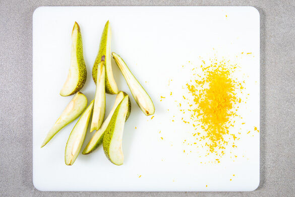 Den Backofen auf 200°C (180°C Umluft) vorheizen. Die Burrata aus dem Kühlschrank nehmen. Die Birnen achteln und entkernen. Die Orangenschale abreiben.